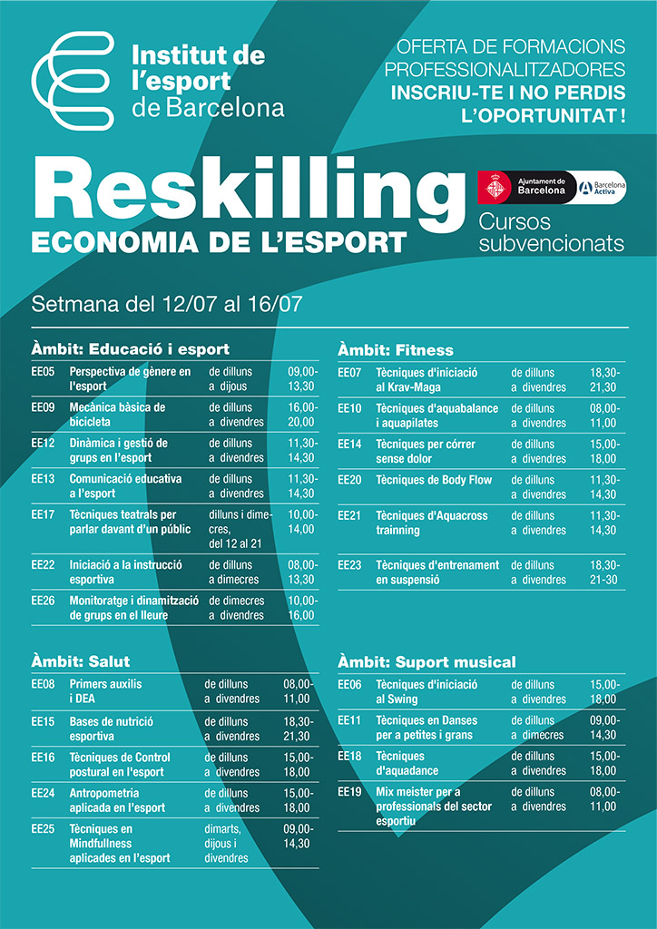 Troba el teu a l’apartat Estudis-Cursos d’estiu i inscriu-te a les formacions de l’Economia de l’esport a la web de Barcelona Activa!